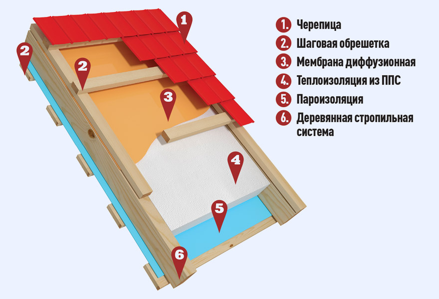 Разработан шаблон спецификации в соответствии с ГОСТ Р 21.1101-2013. Крыша мансардная, состоящая из утеплителя из пенополистирольных плит ППС10-Р, диффузионной мембраны и слоя пароизоляции. Пароизоляционная пленка монтируется со стороны помещения. Применяется в малоэтажном строительстве.
