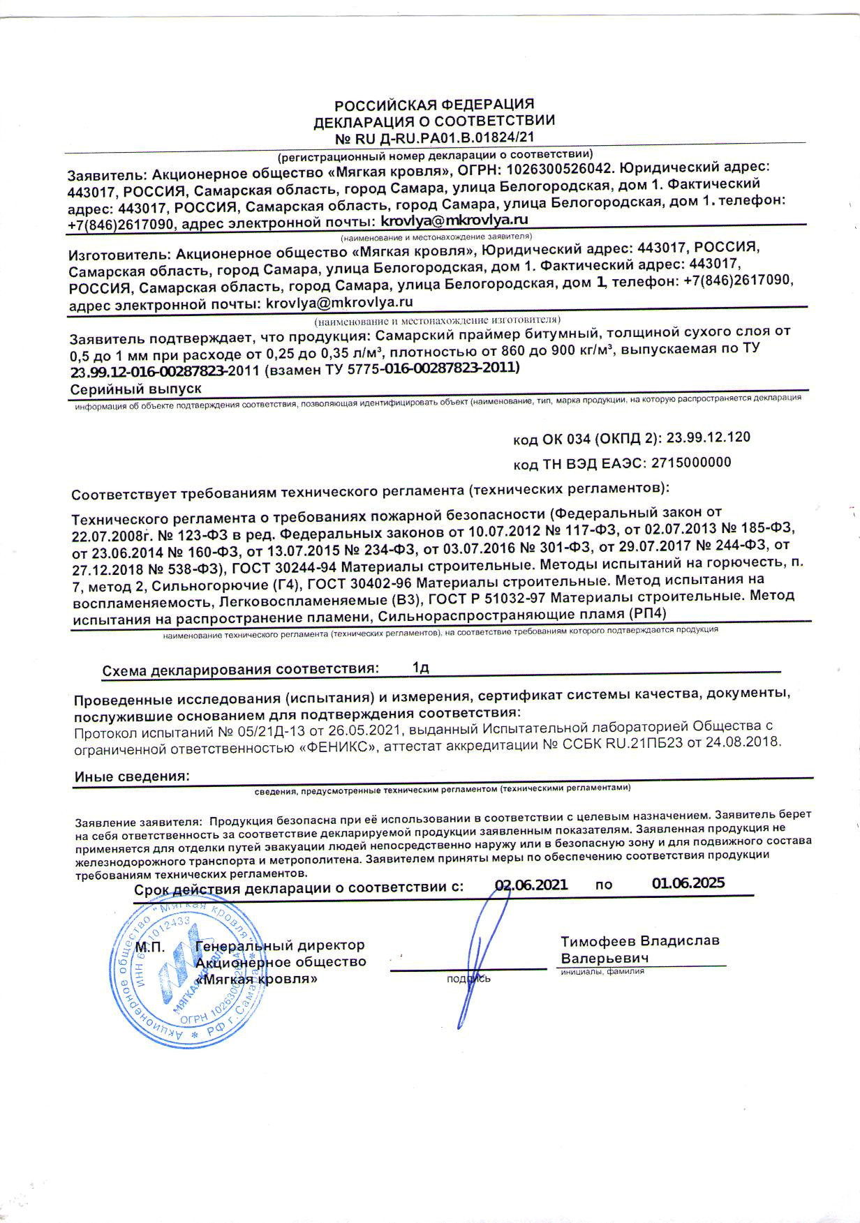 Сертификат соответствия ТУ Самарский Праймер Битумно-Полимерный