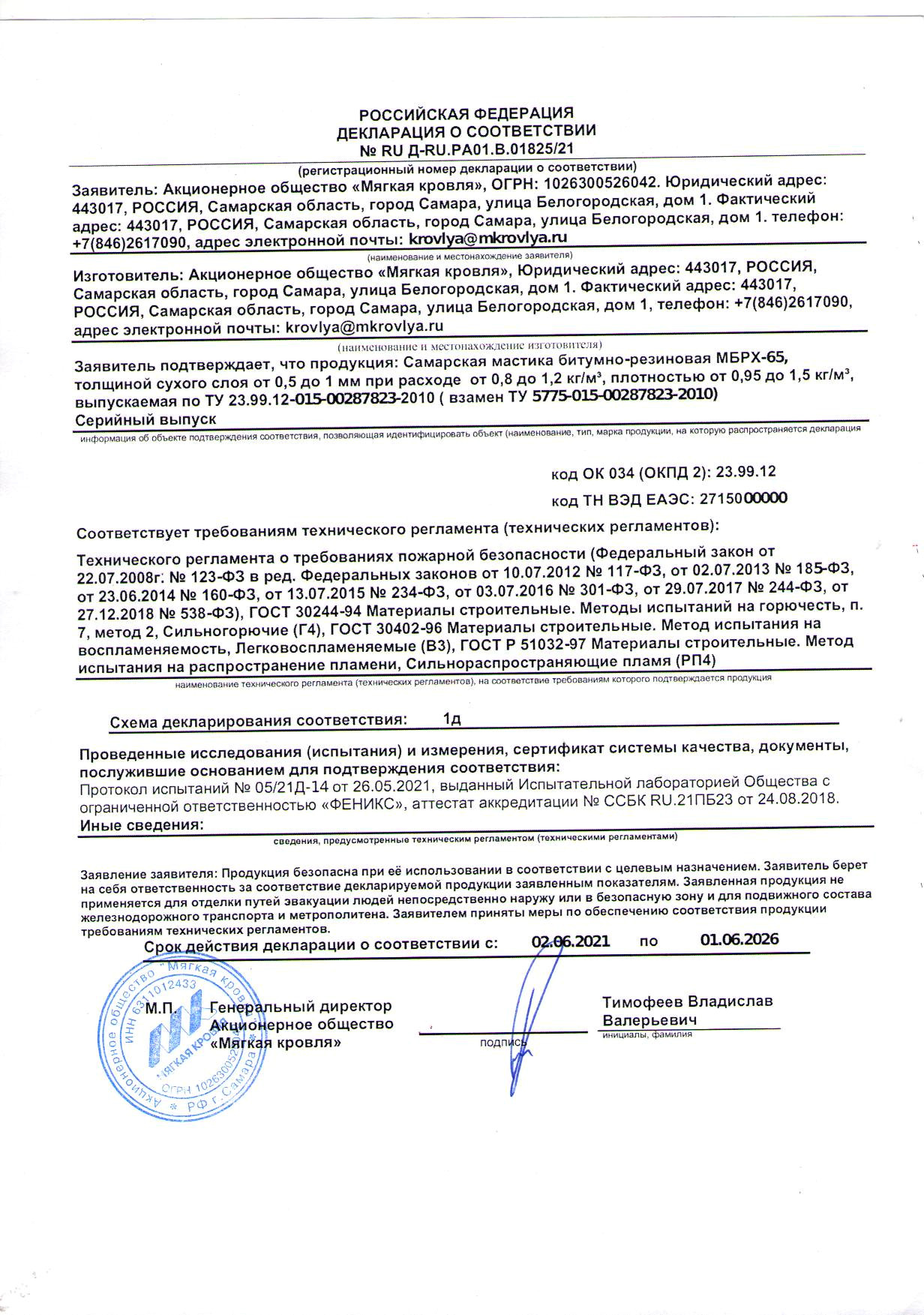 Самарская мастика битумно-резиновая МБР-Х-65. Декларация о соответствии